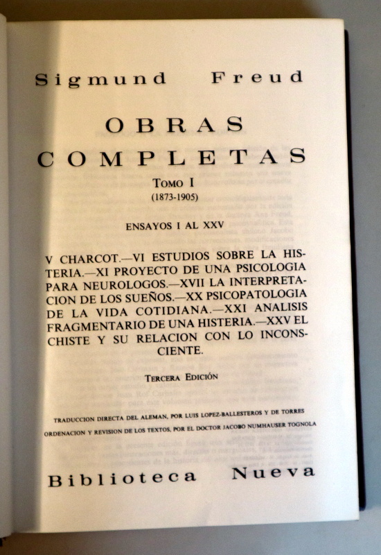 Madrid, Biblioteca Nueva, 1967 - 1968. Traducción directa del alemán por Luis López-Ballesteros y de Torres. Ordenación y Ramón Rey Ardid. Revisión de los textos por el doctor Jacobo Numhauser Tognola. 3 tomos. 3668 p. en total, en numeración seguida. 4º menor. Símil piel editorial con dorados. Papel biblia. Muy buenos ejemplares, impecables.