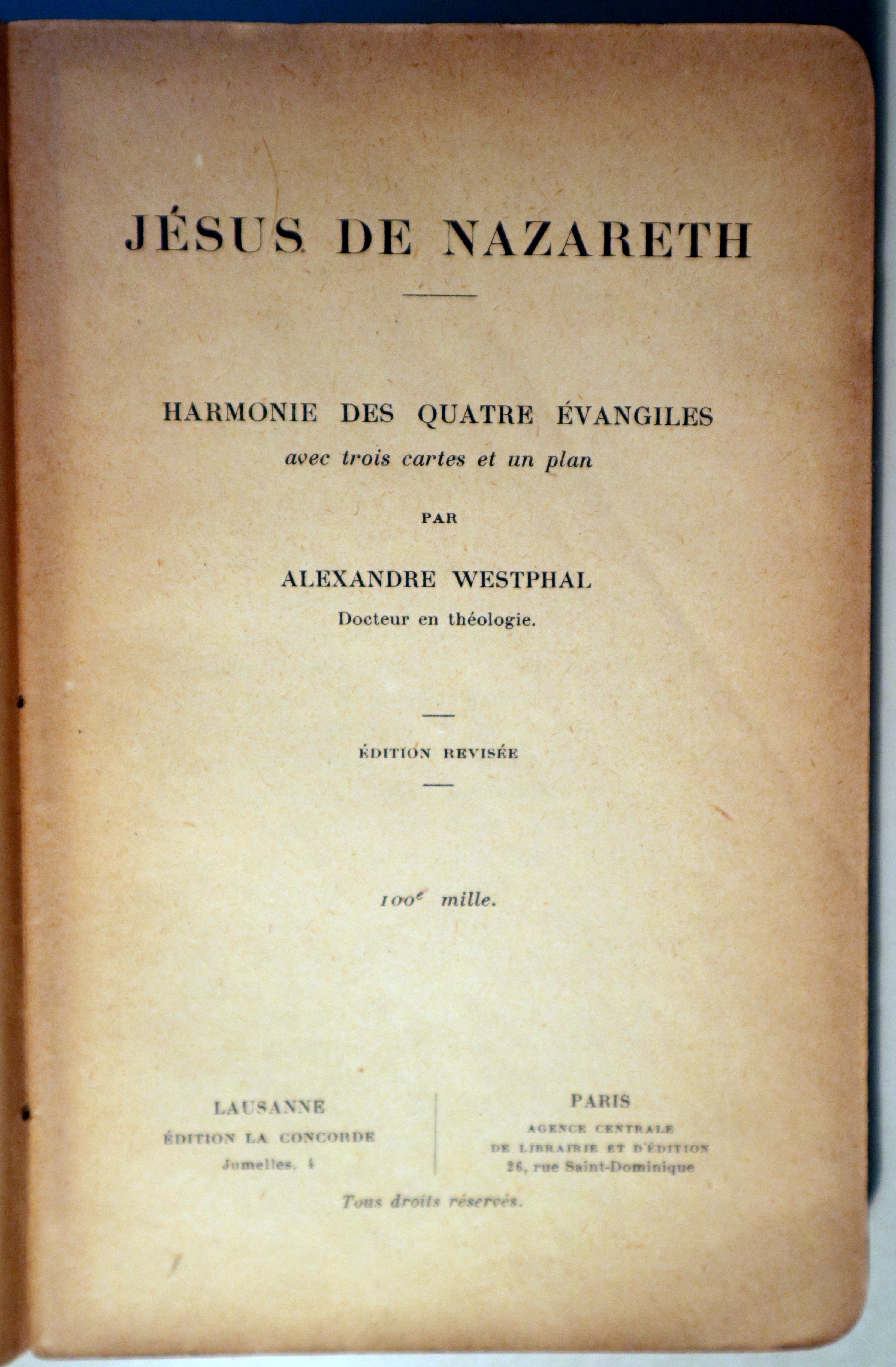 Lausana-París, Édition La Concorde - Agence Centrale de Librairie et d'Édition, 1919. Harmonie des quatre Évangiles, avec trois cartes et un plan. Edition revisée. 313 p. 8º. Rústica editorial levemente rozada. Muy buen ejemplar. Libro en francés. Livre en Français.