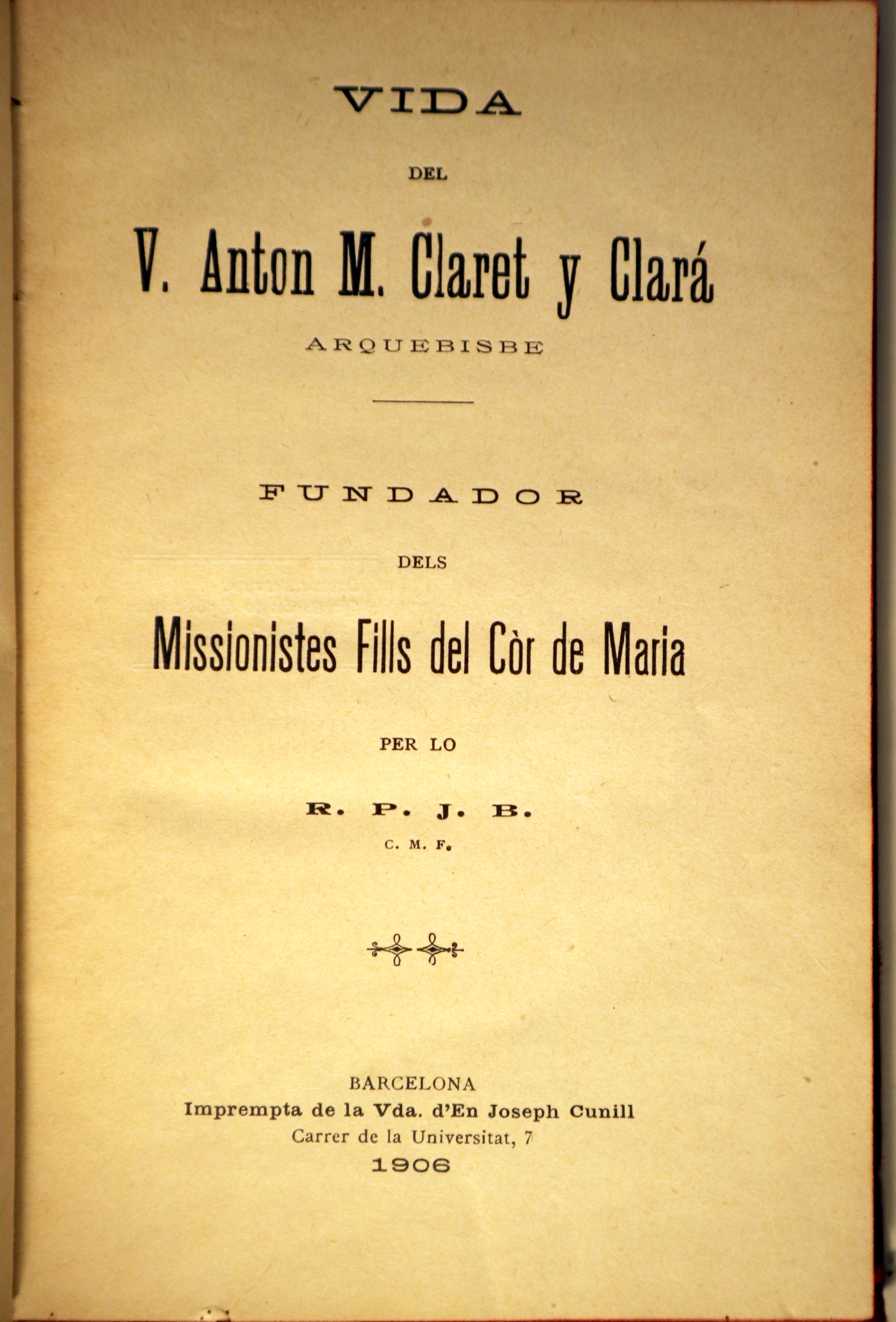 Barcelona, Imprempta de la Vda. d'en Joseph Conill. 1906. "Fundador dels Missionistes Fills del Còr de Maria". Gravats en b/n. 133 p. 8è. Tela editorial. Taques d'òxid. Un pèl gastada. Bon exemplar.