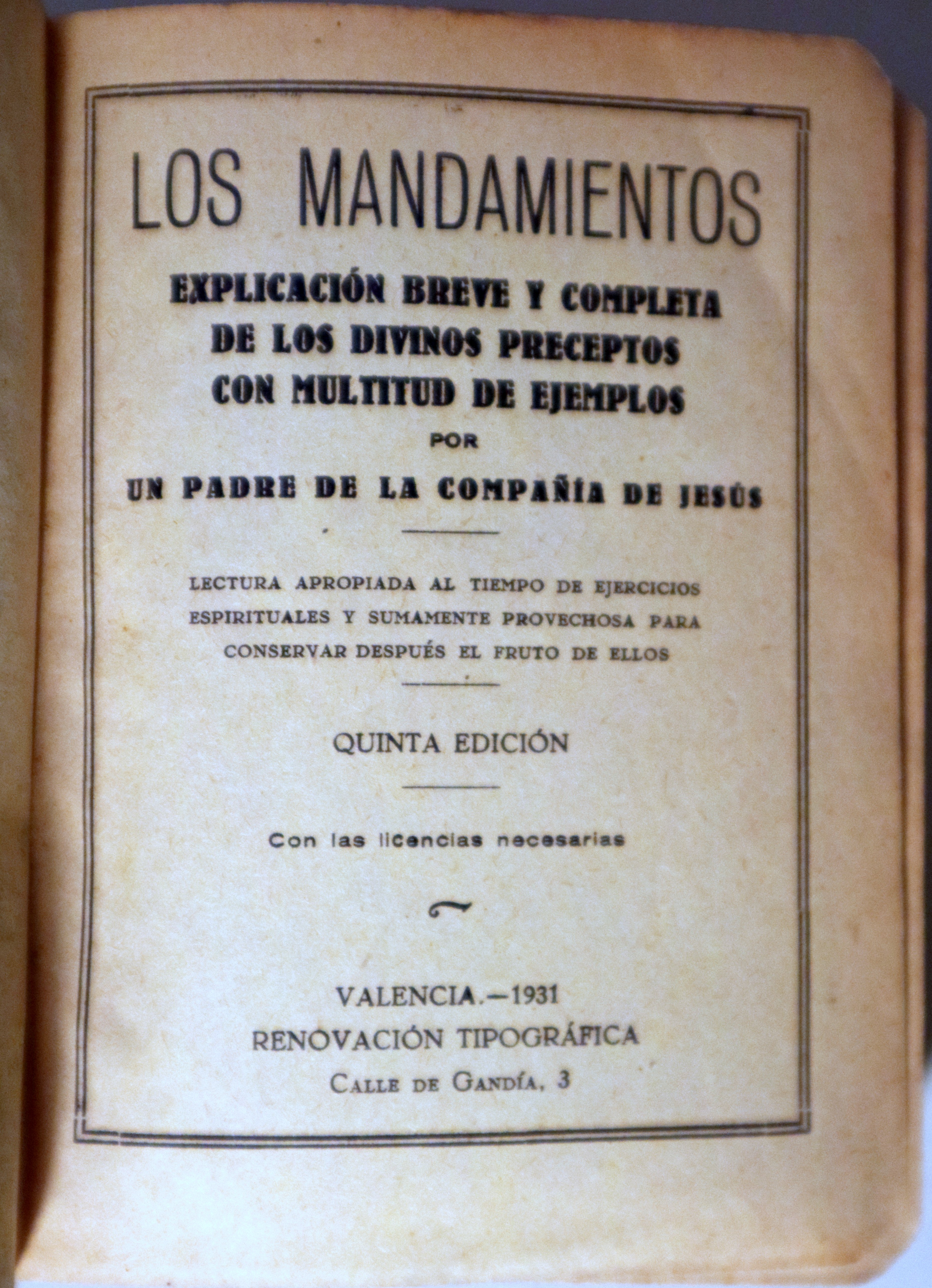 Barcelona, G.P., 1931. Explicación breve y completo de los Mandamientos. Divinos Preceptos con multitud de ejemplos. Por Un Padre de la Compañía de Jesús. 338 p. Pequeño octavo. Tela editorial estampada, con puntas muy levemente rozadas. Buen ejemplar.