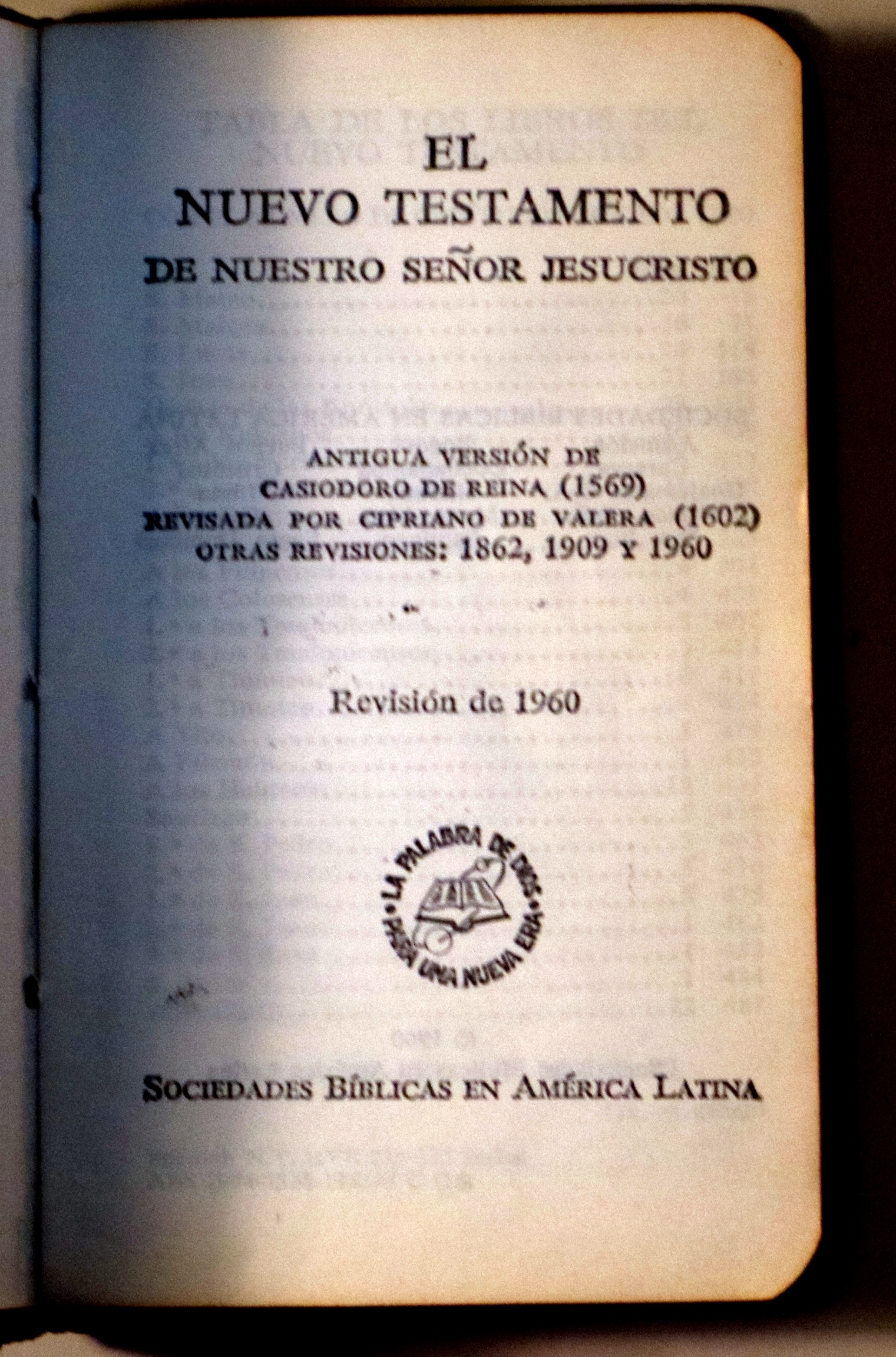 s/l, Sociedades Bíblicas en América Latina, 1960. Revisión de 1960. 697 p. 8º menor. Piel editorial con bordes coloreados. Papel Biblia. Ex-libris. Sello de caucho. Desgaste leve. Buen ejemplar.