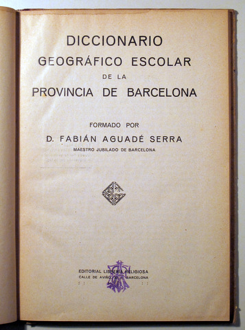 Barcelona, Lib. Religiosa, s/f (c. 1925). 138p. 1h. 4º mayor Encuadernado en holandesa editorial ilustrada, con alguna mancha. Puntas rozadas. Sello de caucho. Buen ejemplar. Relación de las escuelas existententes en todos los pueblos y ciudades de la provincia de Barcelona en la época.