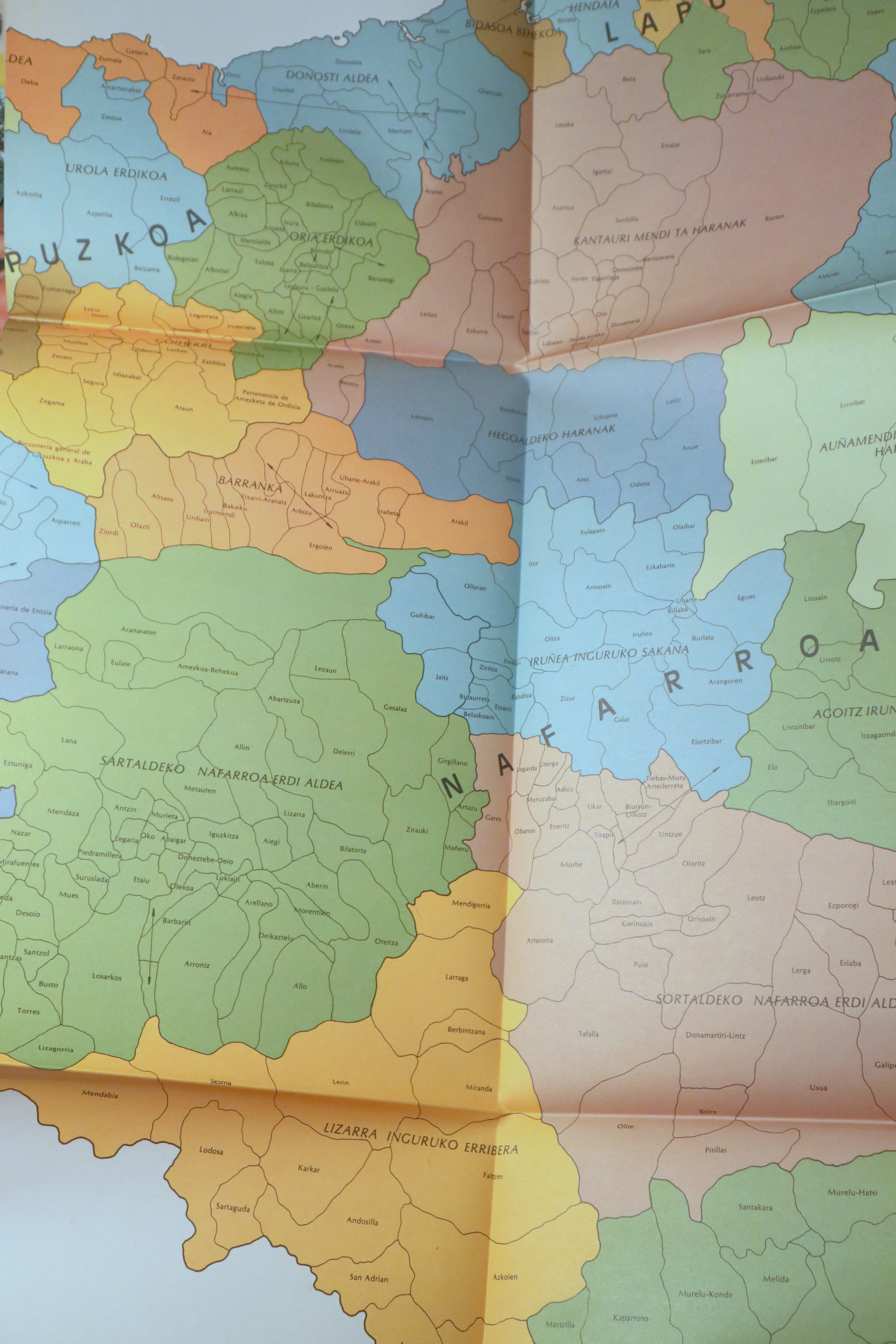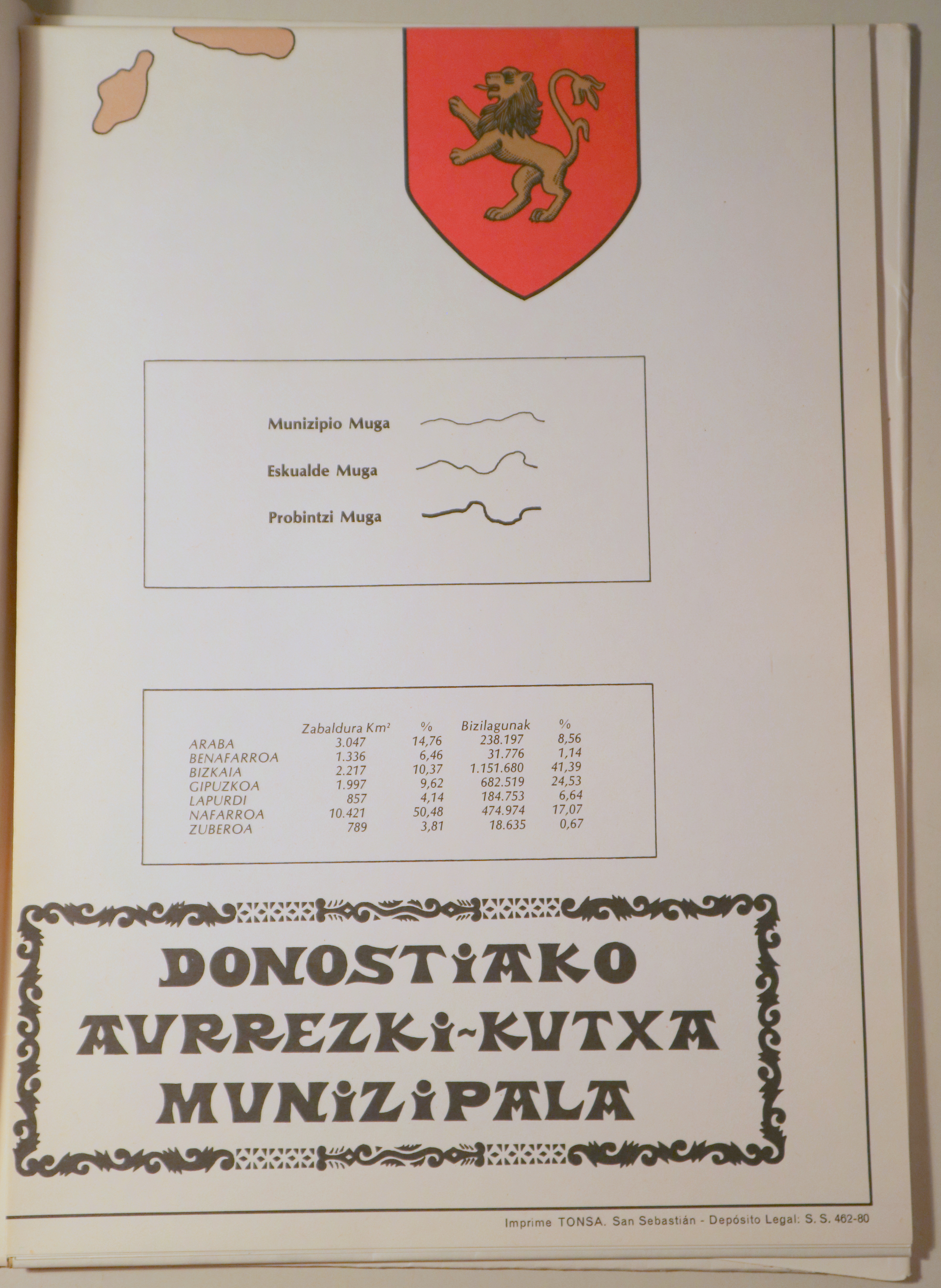 Donostia, Edit. Caja Aho. Municial San Sebastian, 1980. Gran mapa desplegable de Euskal Herria. Folio. Plegado y guardado en una carpeta en rústica ilustrada. Muy buen ejemplar.
